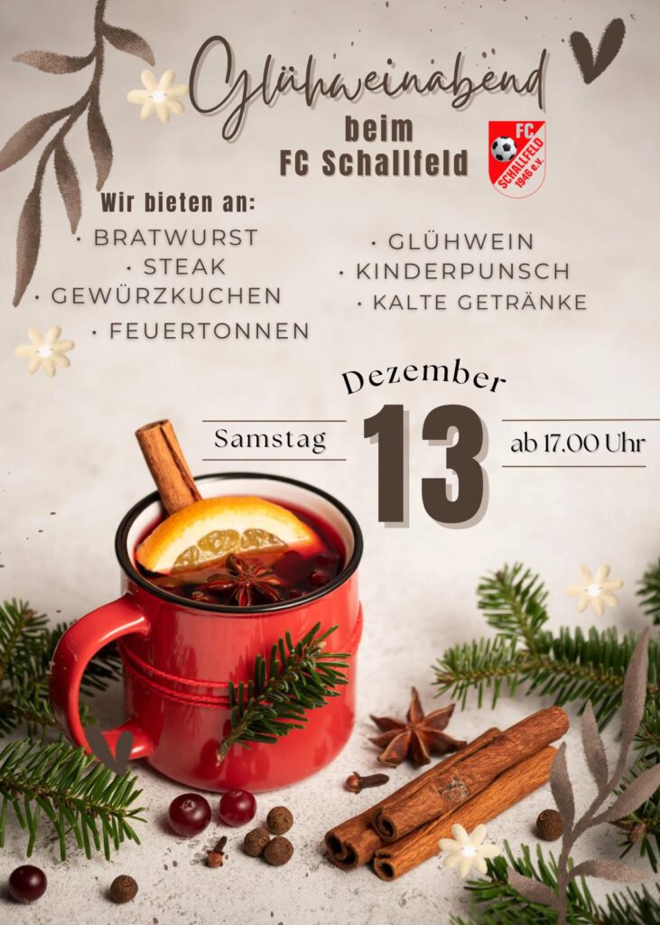 Herzliche Einladung zu unserem Glühweinabend am 13. Dezember ab 17 Uhr auf dem Sportgelände des FC Schallfeld. Bei gemütlicher und weihnachtlicher Atmosphäre wollen wir gemeinsam ein paar schöne Stunden verbringen.